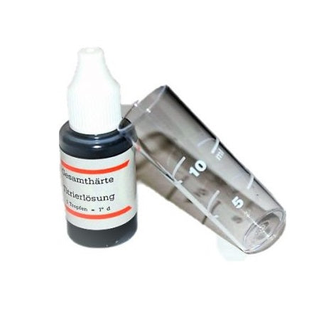 În acest caz, reactivul este adăugat în continuare picătură cu picătură. Numărați picăturile și urmăriți când se schimbă culoarea apei de la roșu la verde; numărul de picături adăugate indică numărul de grade germane.